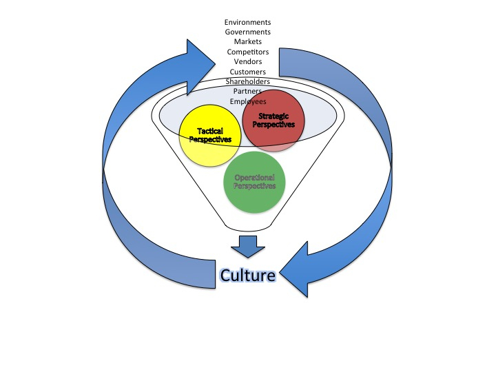 An organization’s culture is a way of thinking, behaving and working within the physical, virtual, legal and mental organizational boundaries. What an organization thinks about its place in the world is shown by its vision, mission statement and (un)displayed values that directly influence internal and external stakeholders. How an organization behaves is shown by leadership examples, levels of (un)trustworthiness, encouragement and discouragement of cross-collaboration and camaraderie. How an organization works is shown by its (un)biased business processes, (non)adoption of technological advancements, (un)approved frameworks/methodologies/approaches, employee (non)recognitions, (un)real career ladders, risk averseness, salaries, (non)physical locations, clothing, and subcultures.