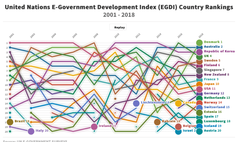 From the above non-exhaustive list, we can see that governments need ICT more than ever to enhance communications and improve operations. This, in turn, means that becoming a Digital Government is not only a nice-to-have but a must-have. The importance of ICT to domestic government operations and international cooperation is such that in 2001 the United Nations (UN) started administering surveys about a country’s e-gov capabilities and then ranking each country through the United Nation’s E-Government Development Index (EGDI). The following chart shows the rankings of the top 20 countries from 2001 to 2018: